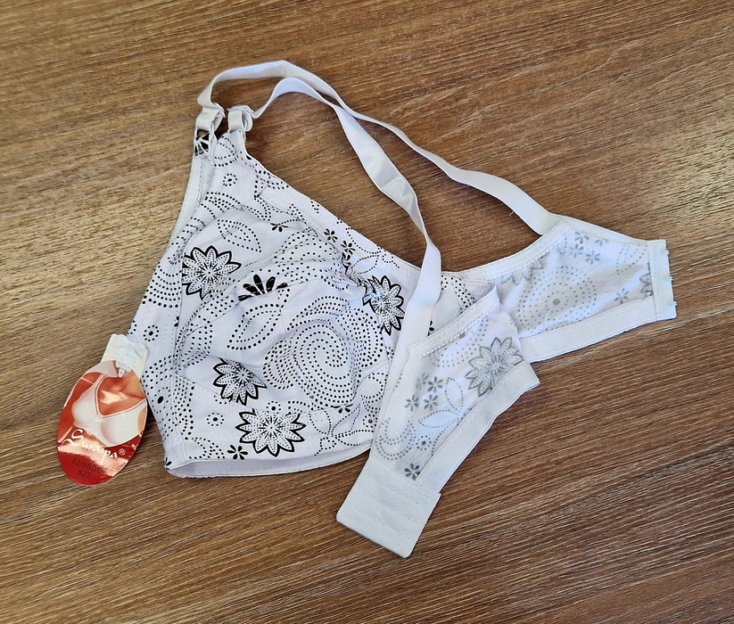 Elastīgs, miesai tīkama materiāla, samtaini maigs, komfortabls. Ar 2 cm platām lencītēm un aizdarei 3 āķīši.