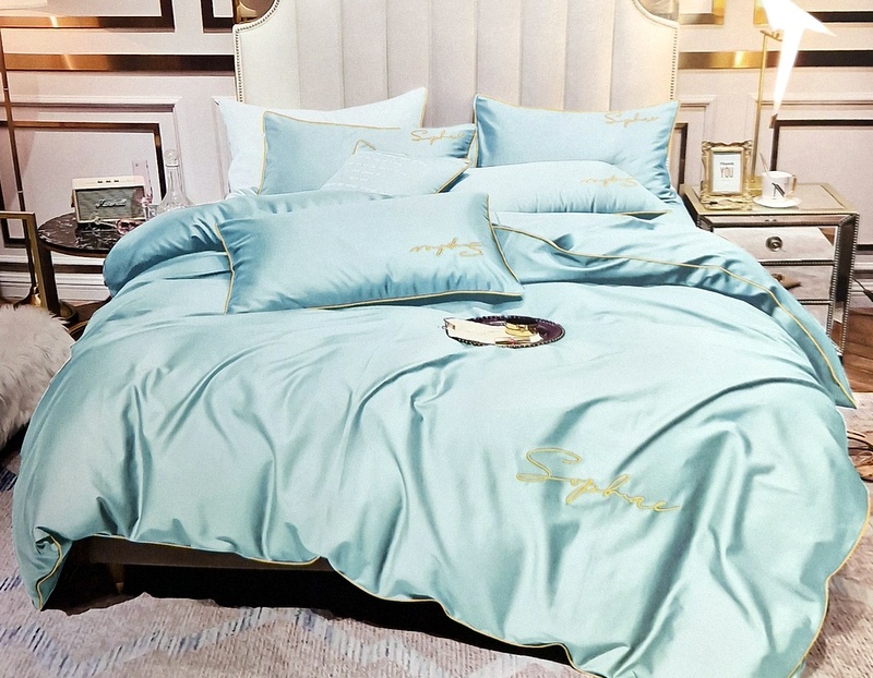 * kvalitatīva gultas veļa ar luksusa izskatu- izšūti uzraksti, izsmalcināta dekoratīvās apdares maliņa